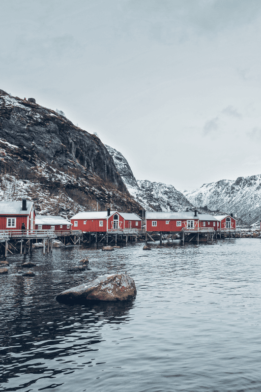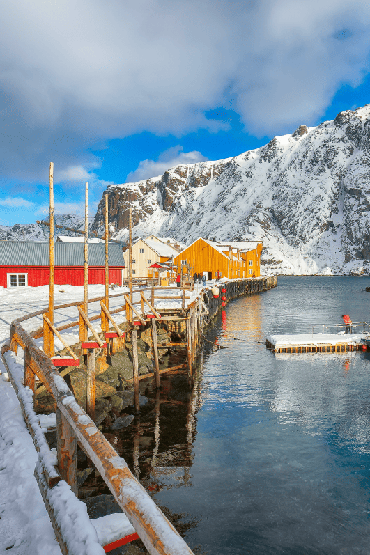 走进努斯峡湾,峡湾深处红黄渔屋如同明信片;