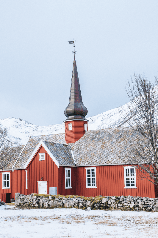18世纪红色木质教堂,背靠山体,色彩对比鲜明,经典人文+山景机位。